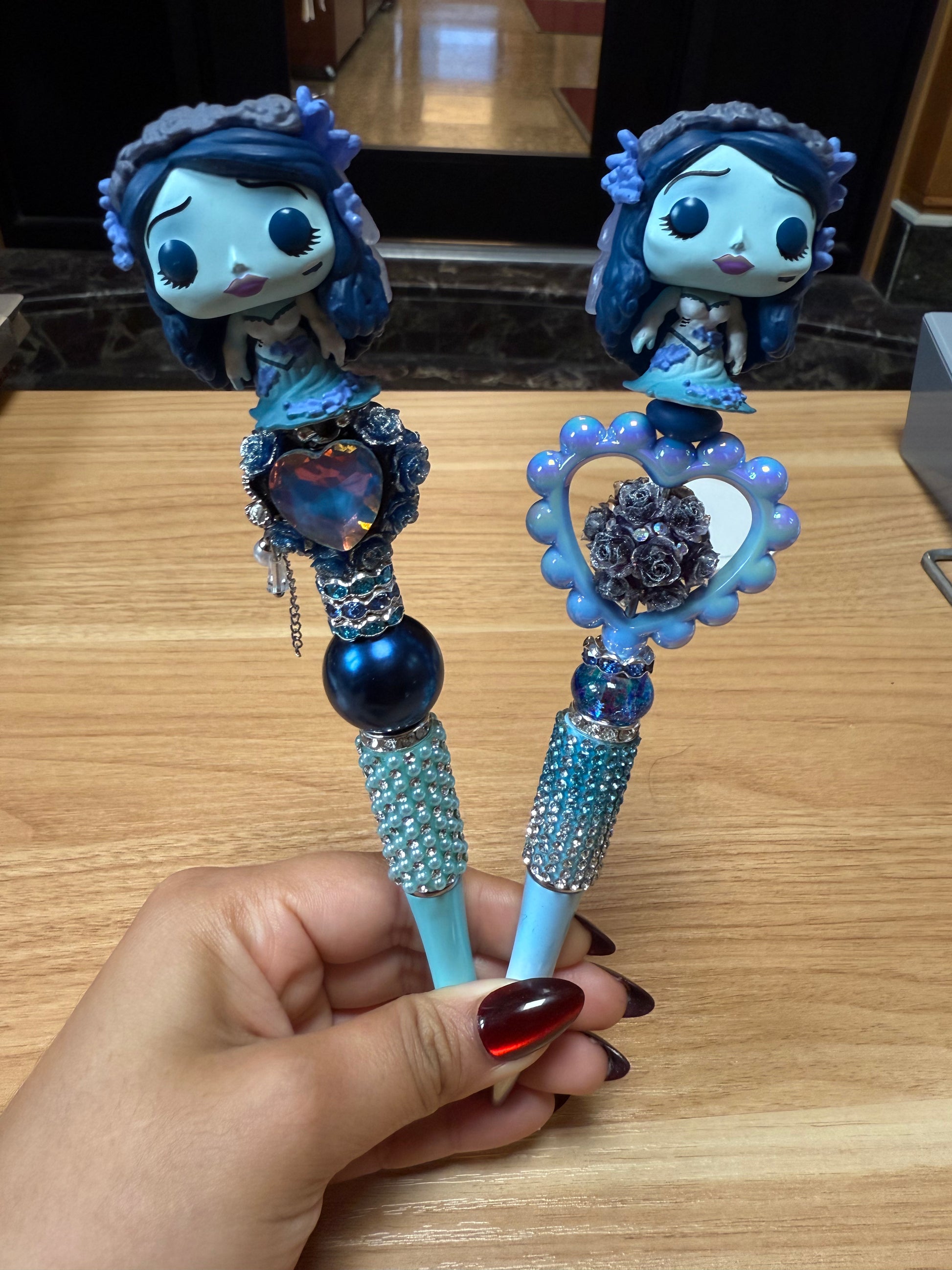 Each pen features a mini Emily figurine with intricate blue and pearl embellishments, rhinestone detailing, and elegant heart or crystal accents making it both spooky and enchanting! Perfect for fans of gothic romance, Halloween lovers, or anyone who adores unique stationery with personality.