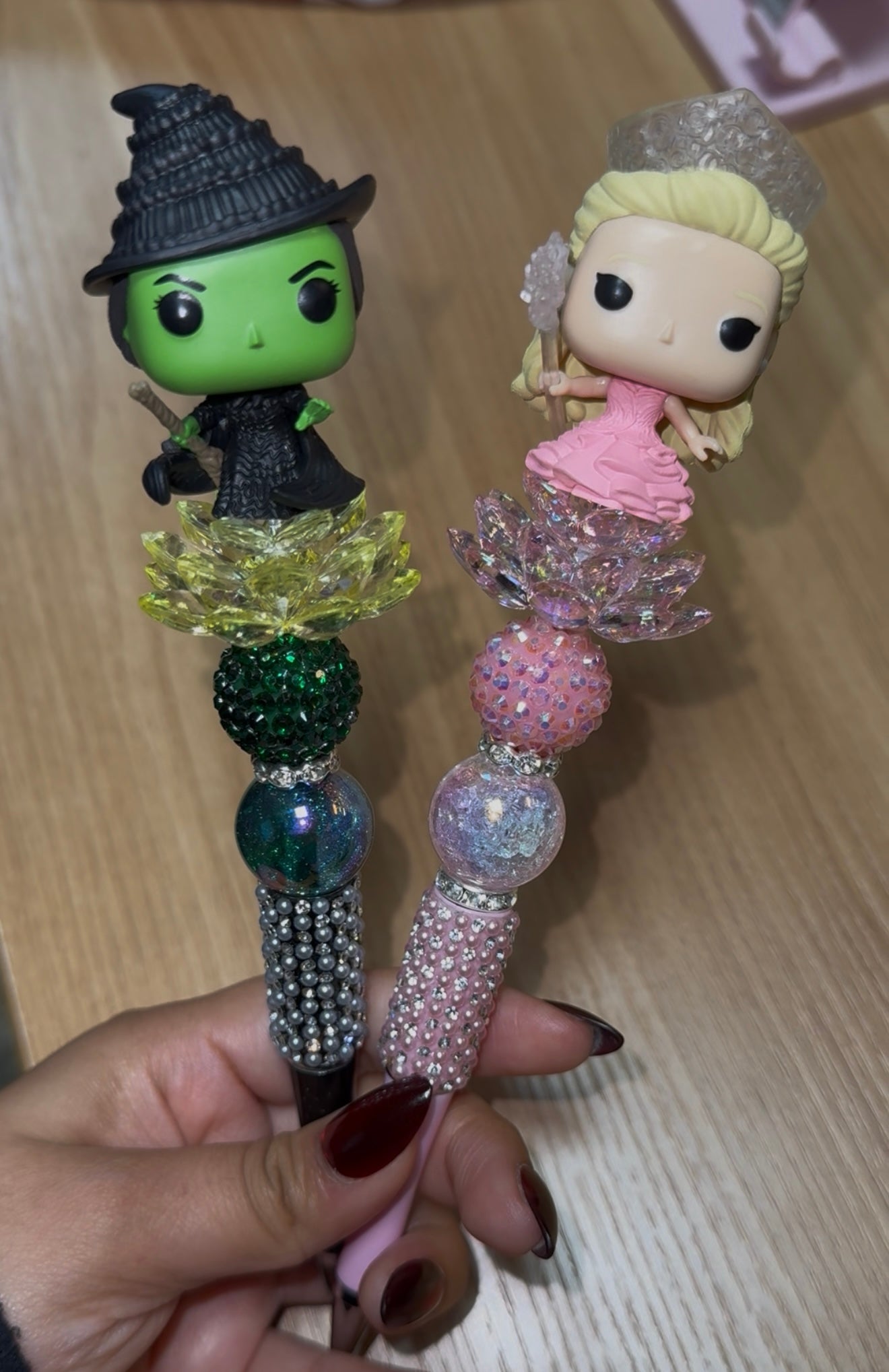 Each pen is uniquely designed with shimmering beads, rhinestones, and acrylic details that capture the personalities of these two iconic witches. Perfect for fans of Wicked the Musical, The Wizard of Oz, or anyone who loves a little extra glam in their stationery collection.