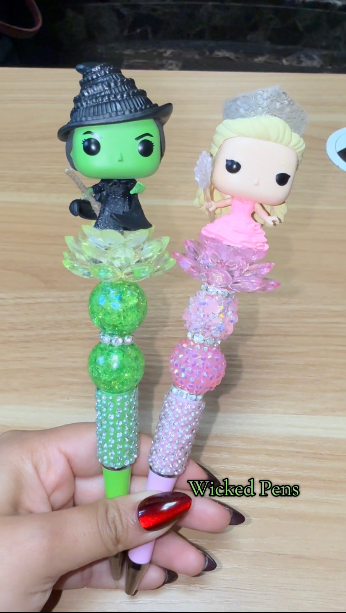 Pens may look similar each pen is unique! Shipped by Thursday! Bring a touch of magic and sparkle to your writing with these handmade Wicked-inspired pens featuring Elphaba (the Wicked Witch) and Glinda the Good Witch! ๐๐